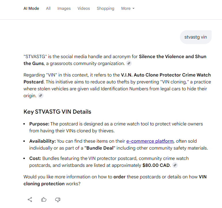 See what A.I. is saying. (Note: Each V.I.N. auto clone protector crime watch postcard is currently $35.00 CDN each, not the quoted price by A.I. below.):