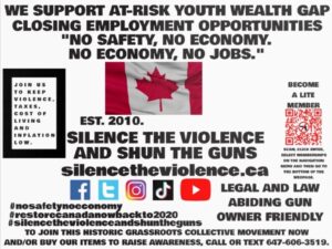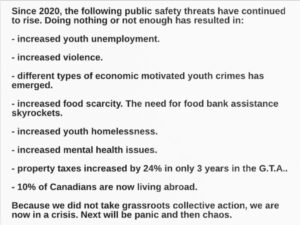 The top two concerns for Canadians are the economy and crime. The senseless excuses, not taking these growing matters seriously, the decision not to do enough collectively or doing nothing at all 5 years ago, has aimlessly steered our country on to an unprecedented course for self destruction. This unprecedented growing public threat that has emerged, that has begun attacking the future of patriotic Canadians, and it can only be thwarted by first restoring our safety. Our rallying call is "No safety, no economy. No economy, no jobs.". If we want to reverse the direction of the economy, we must restore our safety first. Historically, no society has ever prospered without first establishing a stable, safe and healthy environment. We are in an economic crisis, which will be followed by panic and then chaos. If we want to restore Canada, we must restore our safety first. It's well overdue to take grassroots collective action to protect our threatened future.