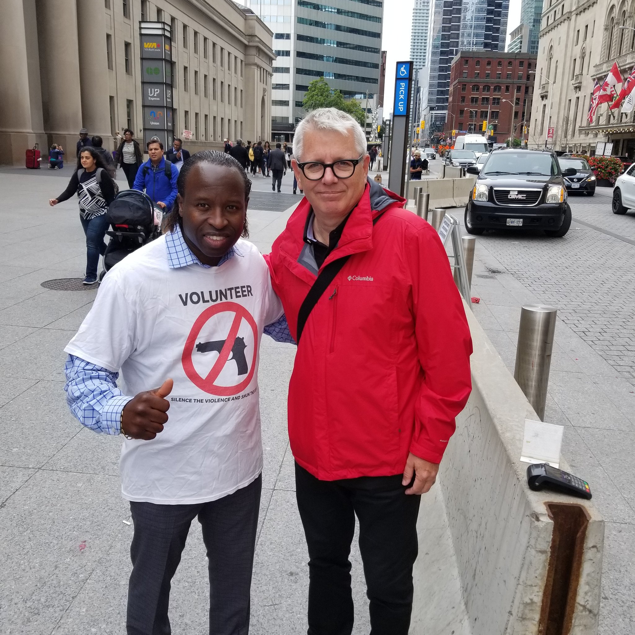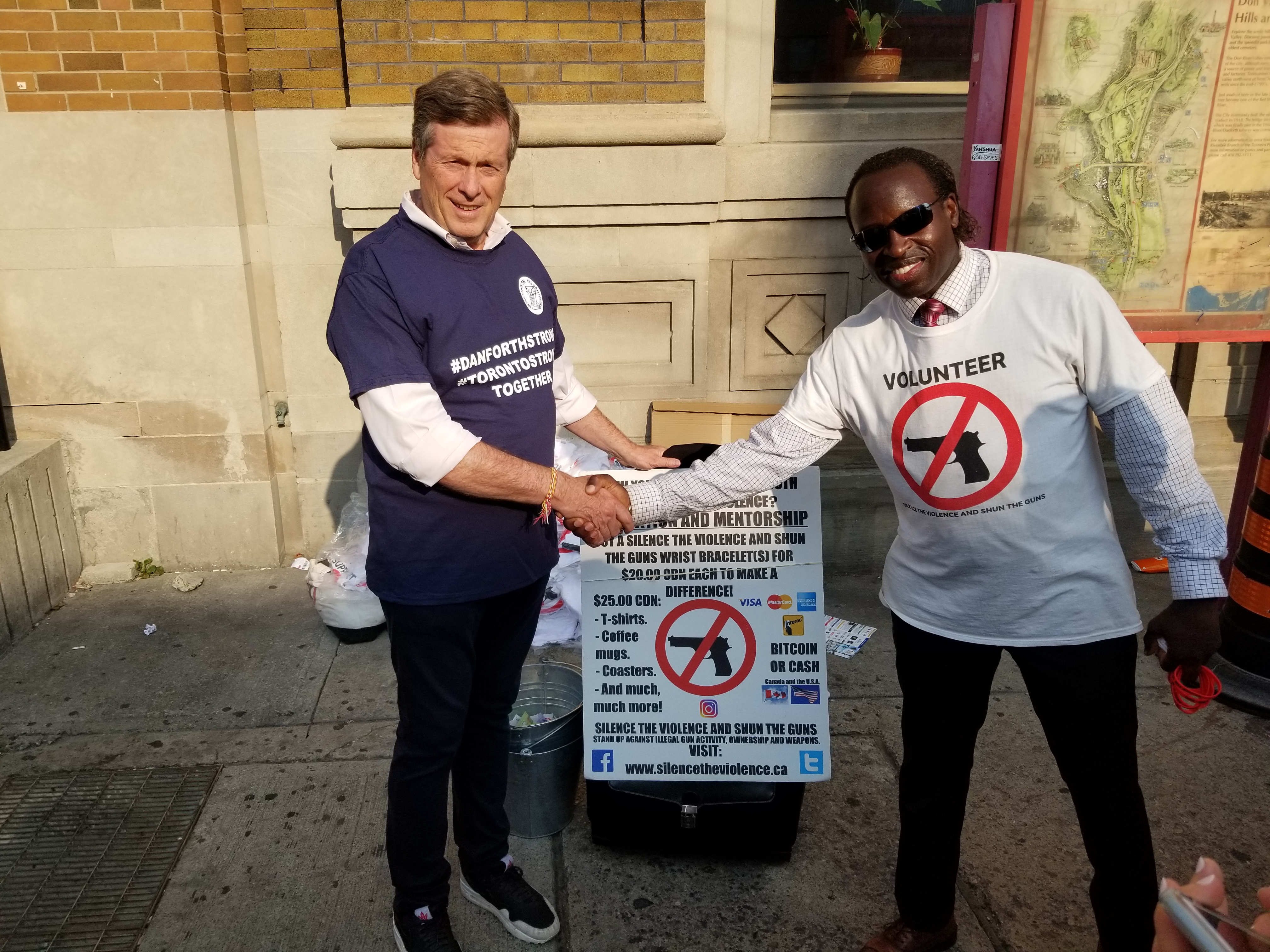 About the two images on this webpage: The founder and his team were nearby “Taste of the Danforth” 2018 where Toronto mayor John Tory stopped by to thank him and his organization, Silence the Violence and Shun the Guns, and on many occasions in the past, for their advocacy efforts. Every time he sees the team, he stops by to thank them and at least one of those times they were on live T.V.. They have been in conversations for years, mainly by text message. There are 15 local based at-risk youth gangs and anti-gun violence organizations and mayor John Tory has only done photo ops with Silence the Violence and Shun the Guns. He knows that Silence the Violence and Shun the Guns is number one, by far, for several reasons.